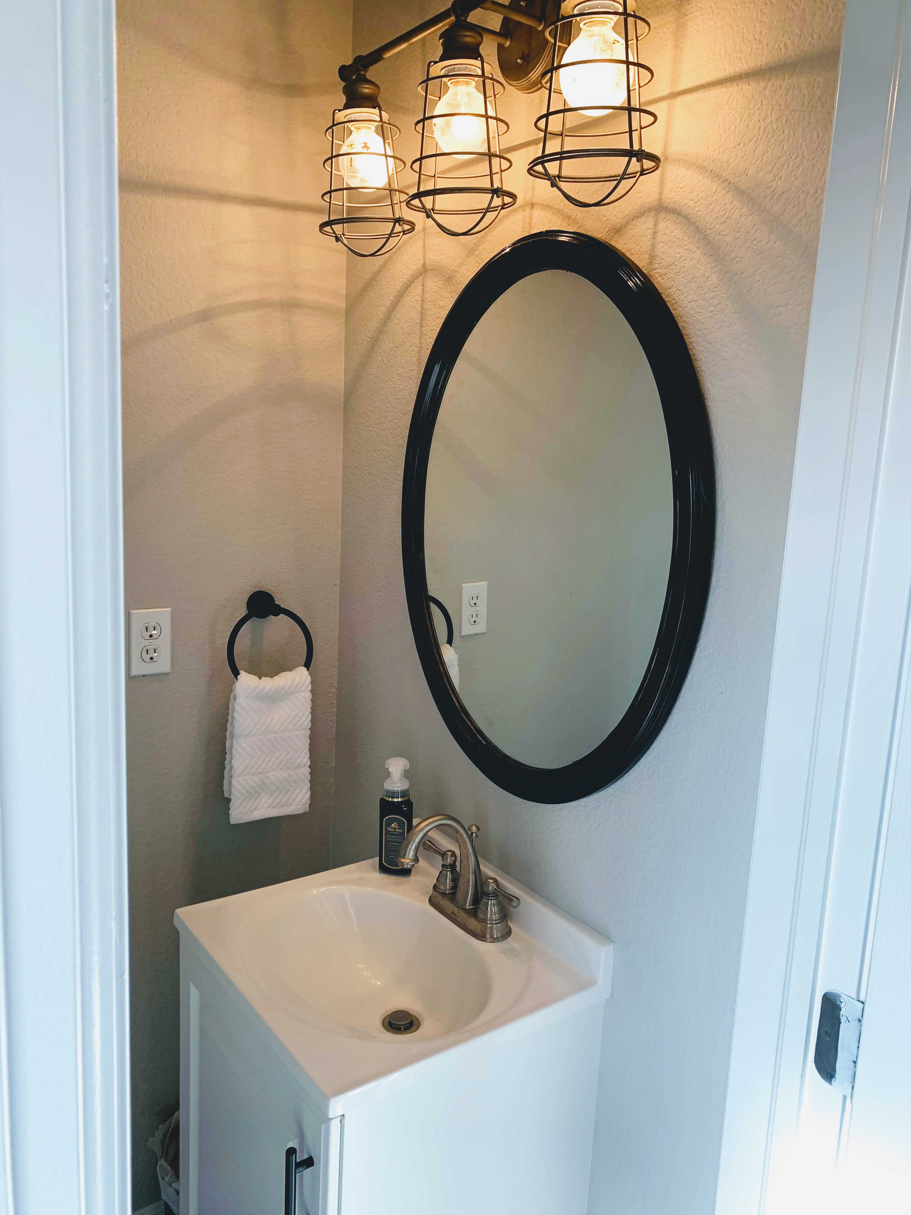 Step 2: Upgrade your hardware. My favorite Saturday activity is browsing the aisles of our local habitat for humanity (and surfing on amazon.com) for light fixtures, hardware and unique decor items. In our 1/2 bath I found a farmhouse/industrial light fixture (new $75, I paid $12at Habitat for Humanity), set of floating shelves $65 (amazon.com), towel ring $10 and toilet paper holder $12 (amazon.com). I also found the perfect size mirror on Facebook marketplace for $20.00 that just needed a can of spray paint. Eventually, I will replace the faucet to match the hardware, but for now I like the mismatch, it reminds me of our everyday life ๐