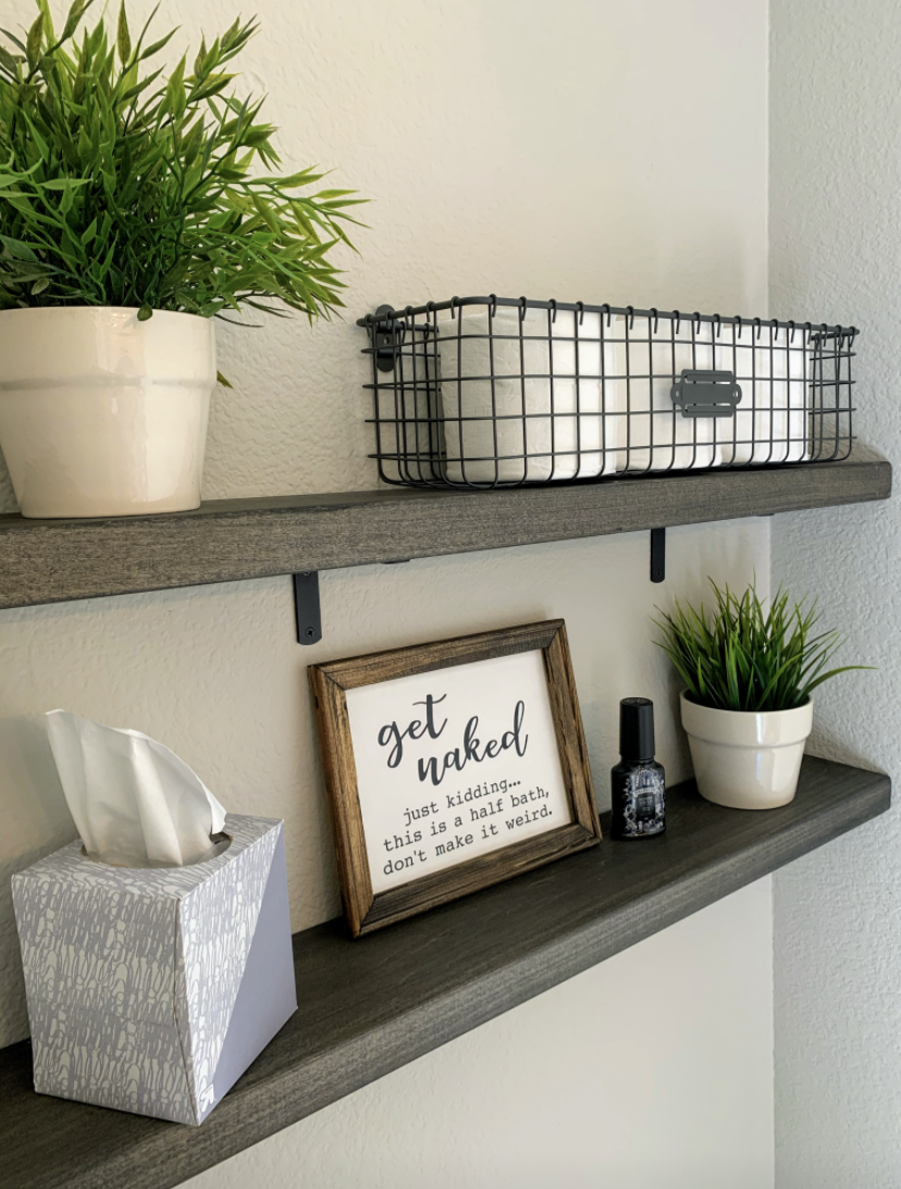 Step 3: Style your space with pieces that are as unique as you and your household. Maybe your a succulent kind of person, or maybe your a provocative ‘get naked’ sign kind of person. No matter what you do, this is your time to personalize your space and give your guests something to keep them busy. Etsy is my favorite as it has endless options of funny, sarcastic, witty and sophisticated bathroom pieces. Plus, with Etsy you get to support a small business and make your 1/2 bathroom dreams come true!